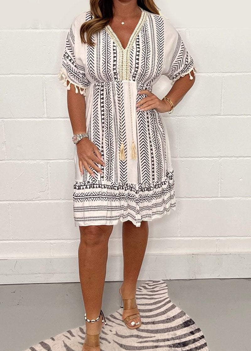 Kaisha is designed to help you feel light, comfortable, and beautifully feminine. With its breezy cut, stylish print, and flattering V-neckline, it's perfect for sunny days when you want effortless movement and easy elegance—from city strolls to summer celebrations.